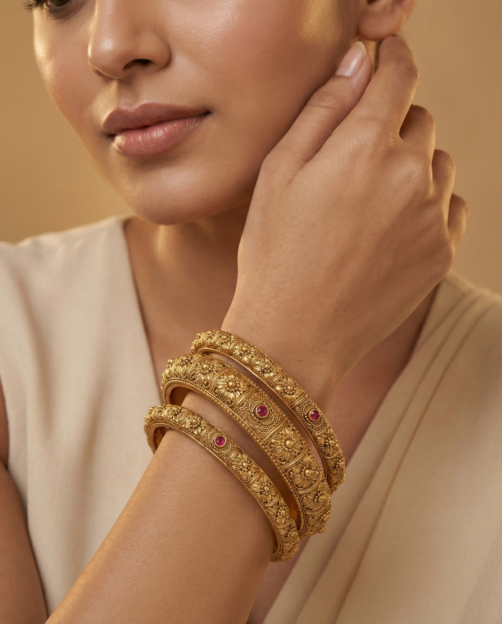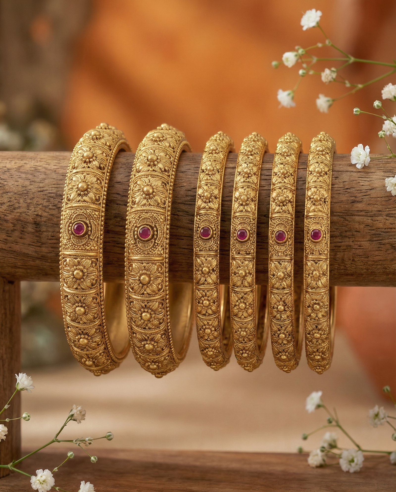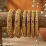 This premium bangle set features detailed antique-style craftsmanship with beautifully carved floral patterns and embedded ruby-toned stones. The rich matte gold finish gives it a grand bridal look, making it perfect for weddings, festive occasions, and traditional outfits.