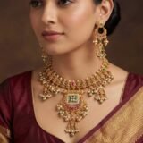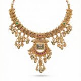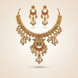 Paired with matching statement earrings that echo the same temple-inspired motifs, this set is perfect for weddings, festive occasions, and traditional celebrations. The rich detailing and traditional silhouette reflect cultural elegance while offering a luxurious presence.
