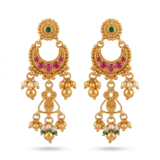 This majestic gold jewellery set is inspired by classic South Indian temple artistry and timeless heritage design. The necklace features intricate antique-finish craftsmanship with detailed filigree work, highlighted by vibrant ruby and emerald accents and finished with graceful pearl hangings. The bold central pendant adds grandeur, making it the focal point of the design.