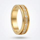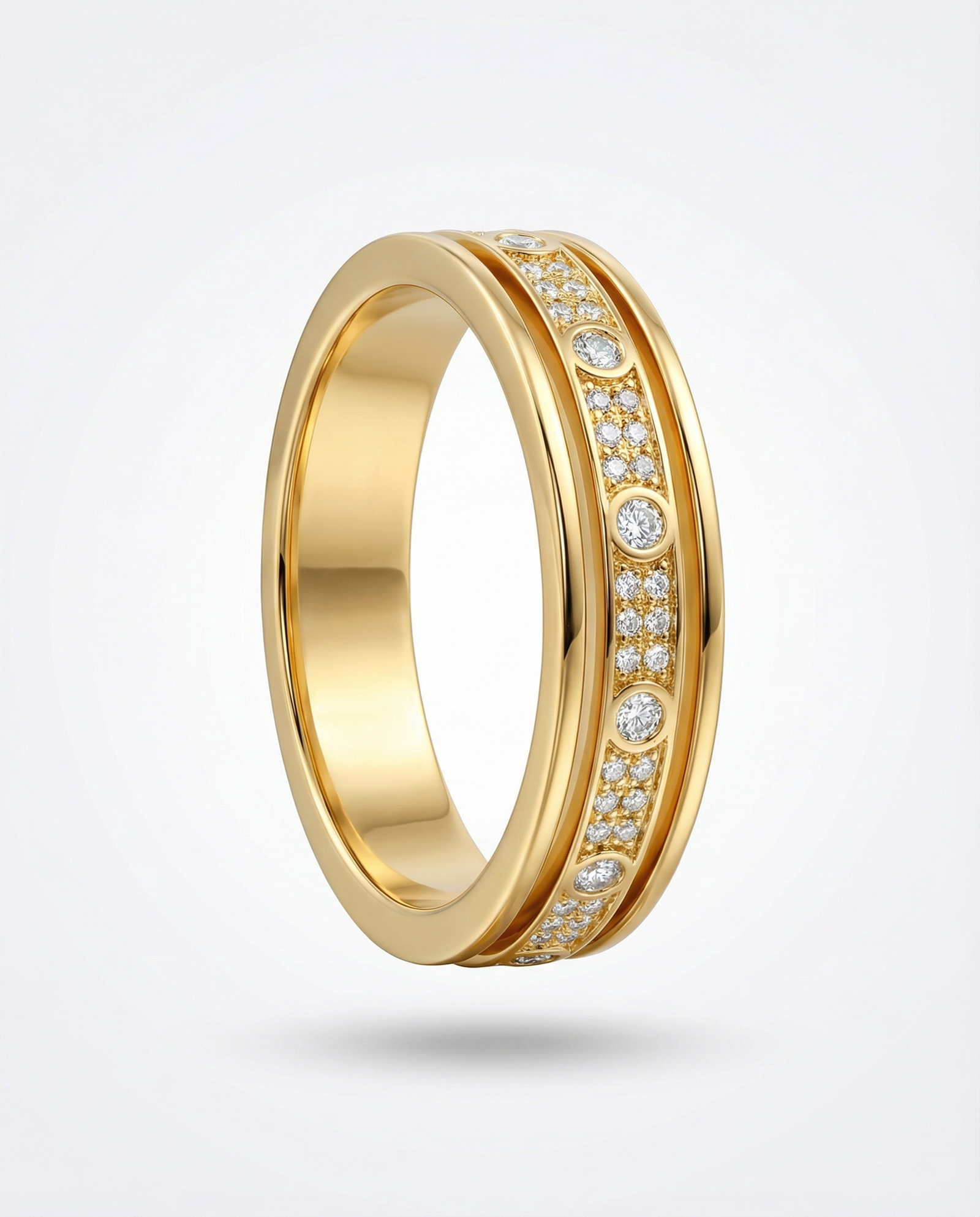 This sophisticated gold band ring is designed with a perfect balance of timeless style and modern detailing. Crafted in a smooth, polished gold finish, the ring features a central channel adorned with a combination of bezel-set round diamonds and closely set pavé diamonds.