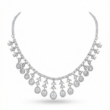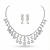 This exquisite diamond necklace set is designed to embody refined elegance and timeless luxury. The necklace showcases a delicate arrangement of leaf-inspired motifs, gracefully finished with cascading teardrop-shaped diamond drops that create a fluid, radiant silhouette. Each element is meticulously crafted to reflect light beautifully, enhancing the overall brilliance of the piece.