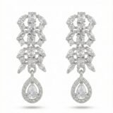 The matching earrings mirror the necklace’s design with layered floral detailing and a soft teardrop finish, making the set perfectly balanced and harmonious. Ideal for bridal wear, receptions, and grand evening occasions, this set adds sophistication without overpowering the look.