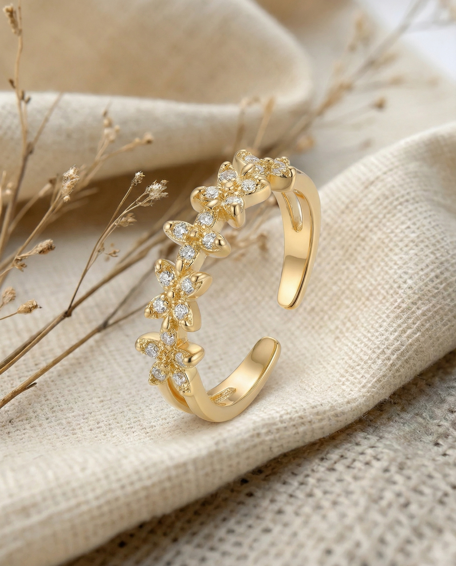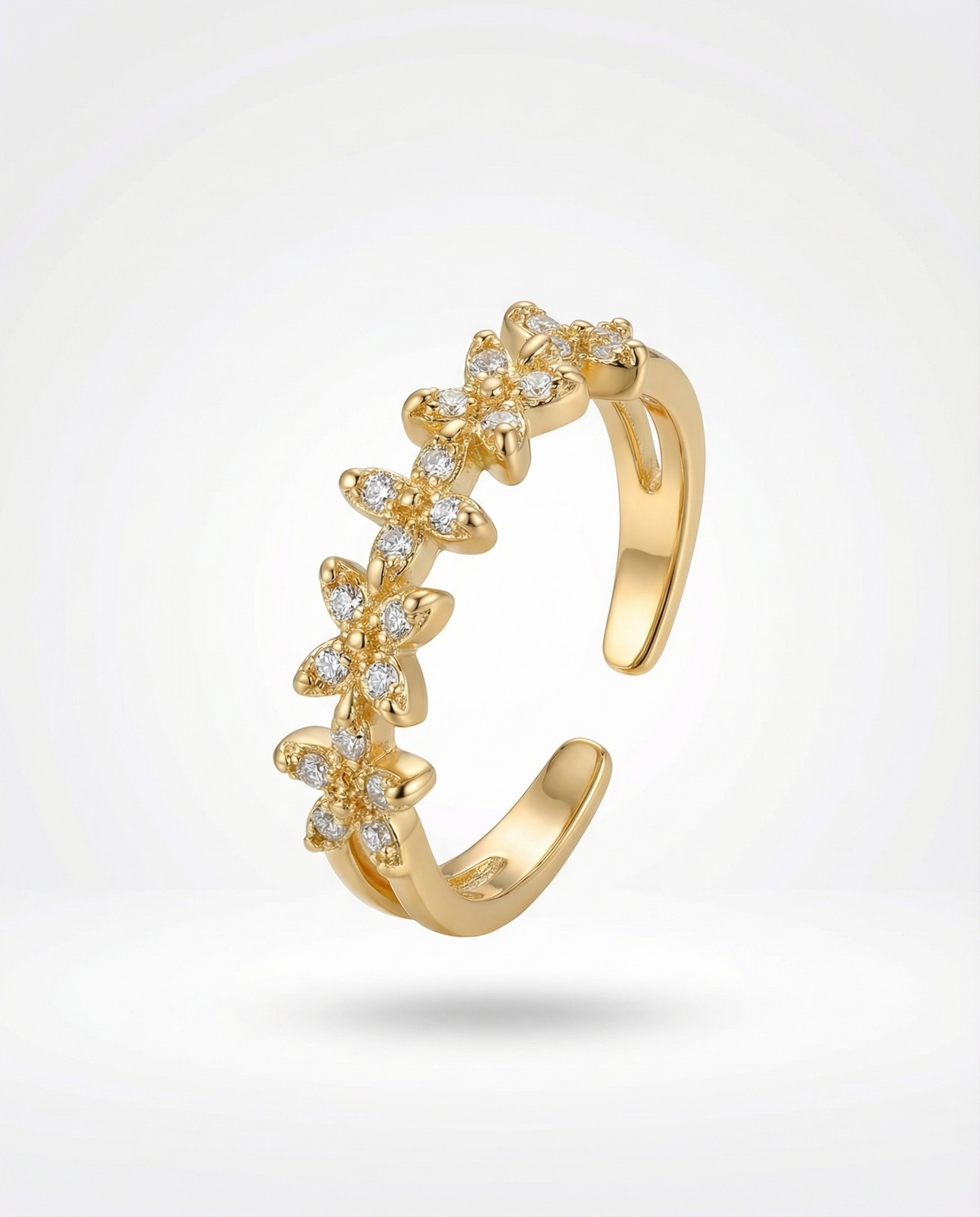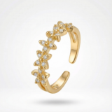 This beautiful floral adjustable ring features a delicate chain of flower motifs, each embedded with sparkling crystals for a premium look. The gold-tone finish adds a luxurious touch, while the open adjustable design ensures a perfect fit for all finger sizes.