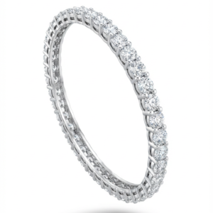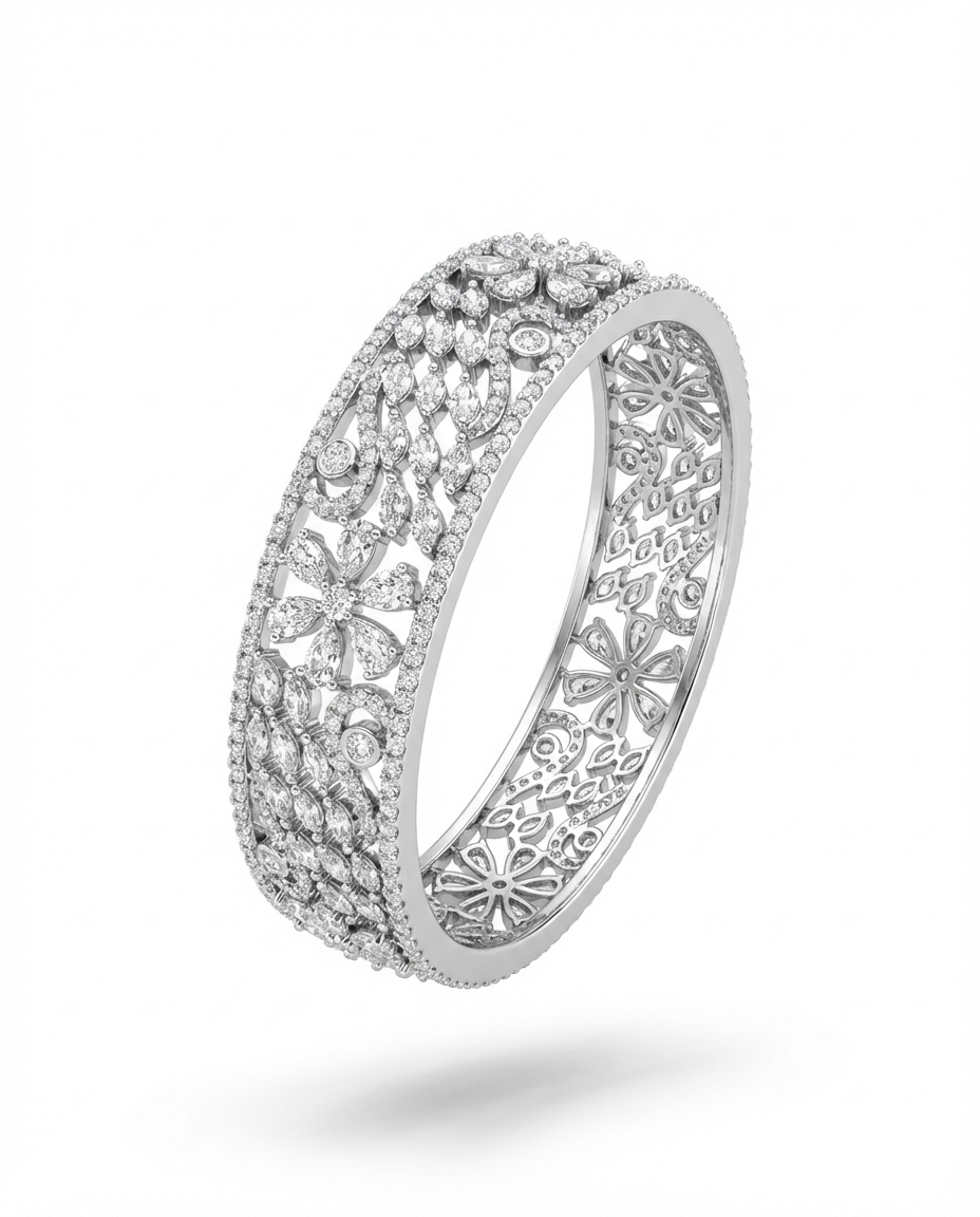 This breathtaking diamond bangle is crafted to showcase fine artistry and refined elegance. Featuring an intricate lattice design adorned with sparkling diamonds, the bangle highlights delicate floral motifs that add depth and graceful charm. The openwork detailing enhances brilliance while maintaining a lightweight and comfortable feel.