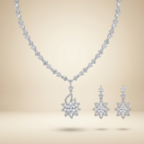 This stunning diamond jewellery set is designed to capture timeless elegance and refined brilliance. The necklace features a beautifully crafted floral pendant with a sparkling central diamond, suspended from a gracefully detailed diamond chain that adds continuous shimmer. The matching drop earrings mirror the floral design, creating a perfectly balanced and harmonious look.