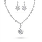 An elegant diamond jewellery set with a radiant floral pendant and matching drop earrings.