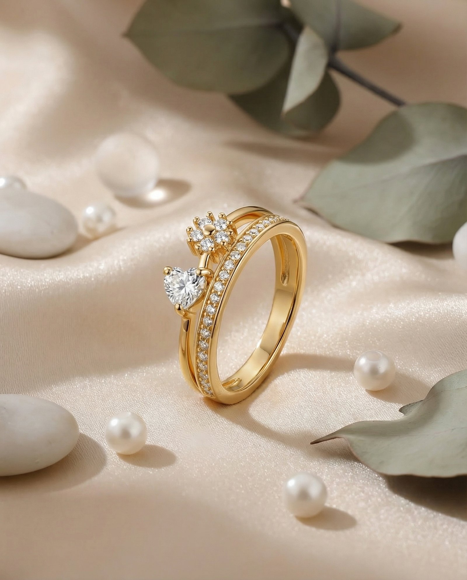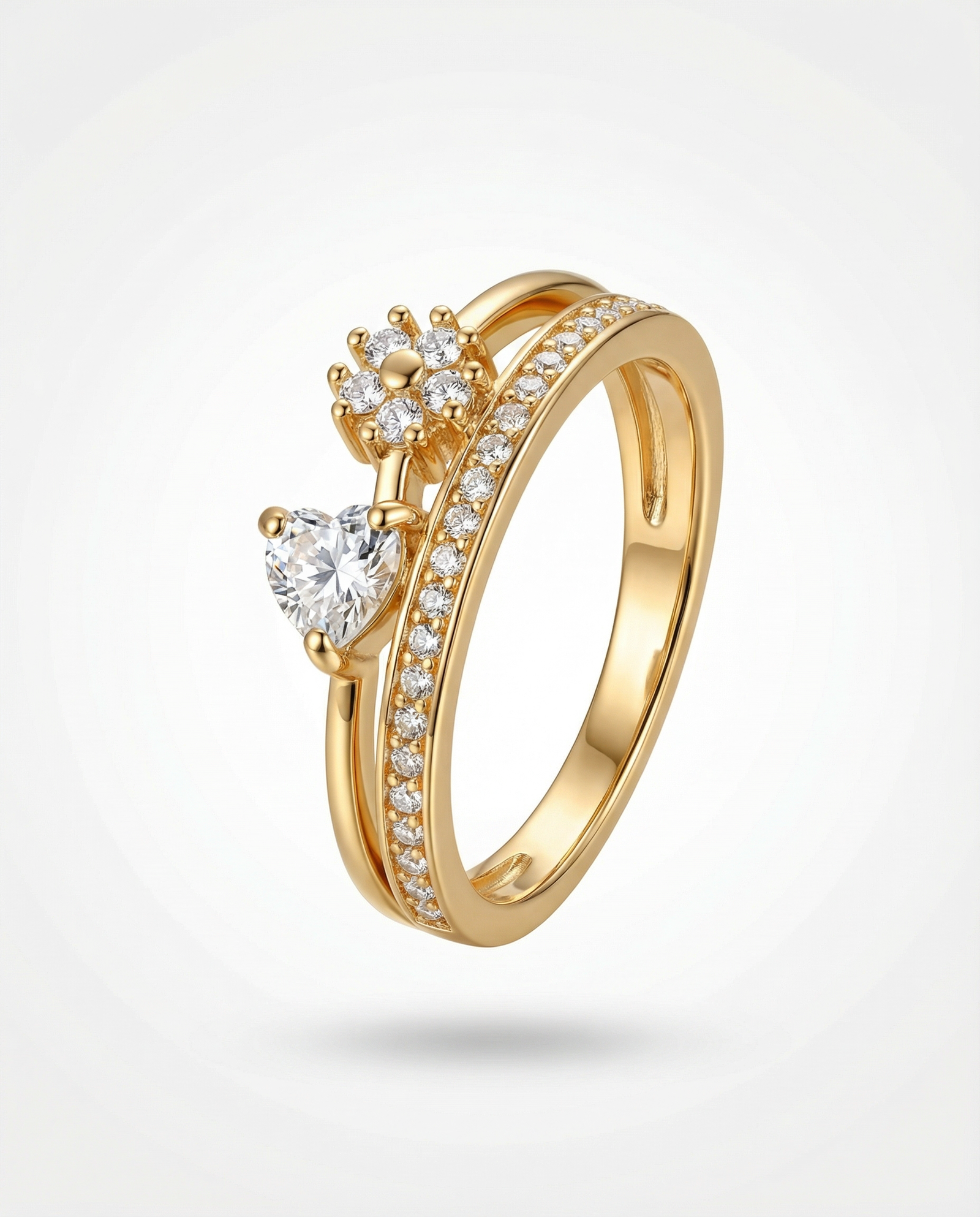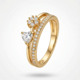This beautifully designed ring combines romantic charm with modern elegance. At its center sits a stunning heart-cut diamond, symbolizing love and sophistication, held securely in a classic prong setting that enhances its brilliance.