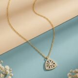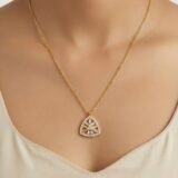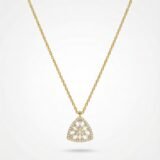 The structured triangular frame is outlined with sparkling stones, enhancing the brilliance and giving the piece a refined, modern aesthetic. Suspended from a delicate gold chain, the pendant sits gracefully, making it perfect for minimal yet statement styling.
