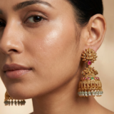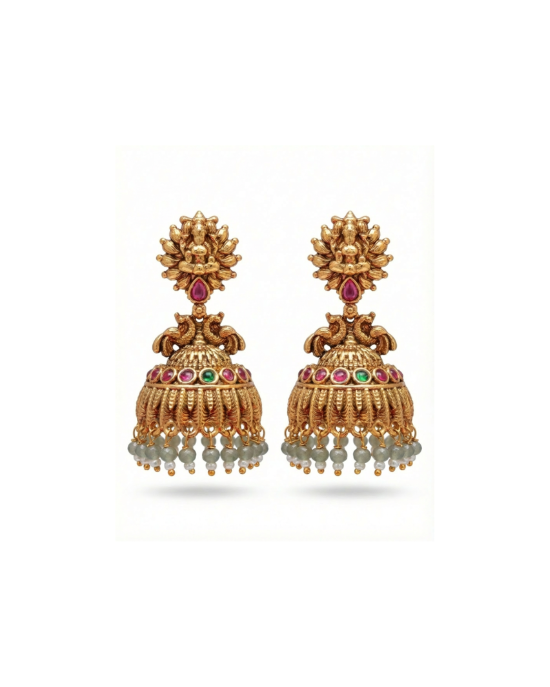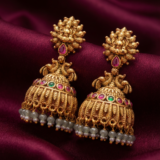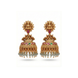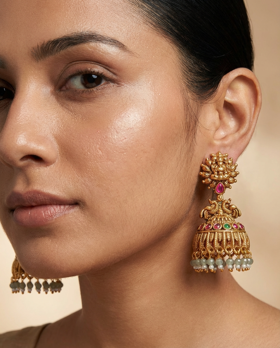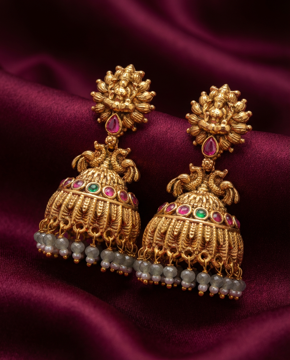 These exquisite temple gold jhumka earrings are inspired by classic South Indian heritage design and divine artistry. The top features a finely sculpted Goddess Lakshmi motif, symbolizing prosperity and blessings, highlighted with a ruby accent. The dome-shaped jhumka is adorned with colorful gemstone detailing and finished with graceful pearl hangings that add movement and elegance.