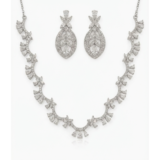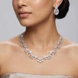 This exquisite diamond jewellery set is inspired by the beauty of nature and refined craftsmanship. The necklace features a flowing leaf-inspired design, intricately set with sparkling diamonds that create a soft, organic rhythm along the neckline. Matching drop earrings echo the same leaf motif, adding harmony and elegance to the set.