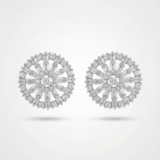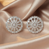 These stunning round halo stud earrings feature a striking sunburst design that radiates elegance and luxury. Crafted with a mix of baguette and round-cut stones arranged in a circular pattern, they create a brilliant shine that mimics high-end diamond jewellery.