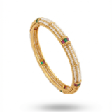 This beautifully designed gold bangle showcases a refined blend of tradition and elegance. Crafted with delicate rows of luminous pearls, it is accented with subtle ruby and emerald stone detailing that adds a rich touch of color. The structured gold framework enhances the design while ensuring durability and comfort.