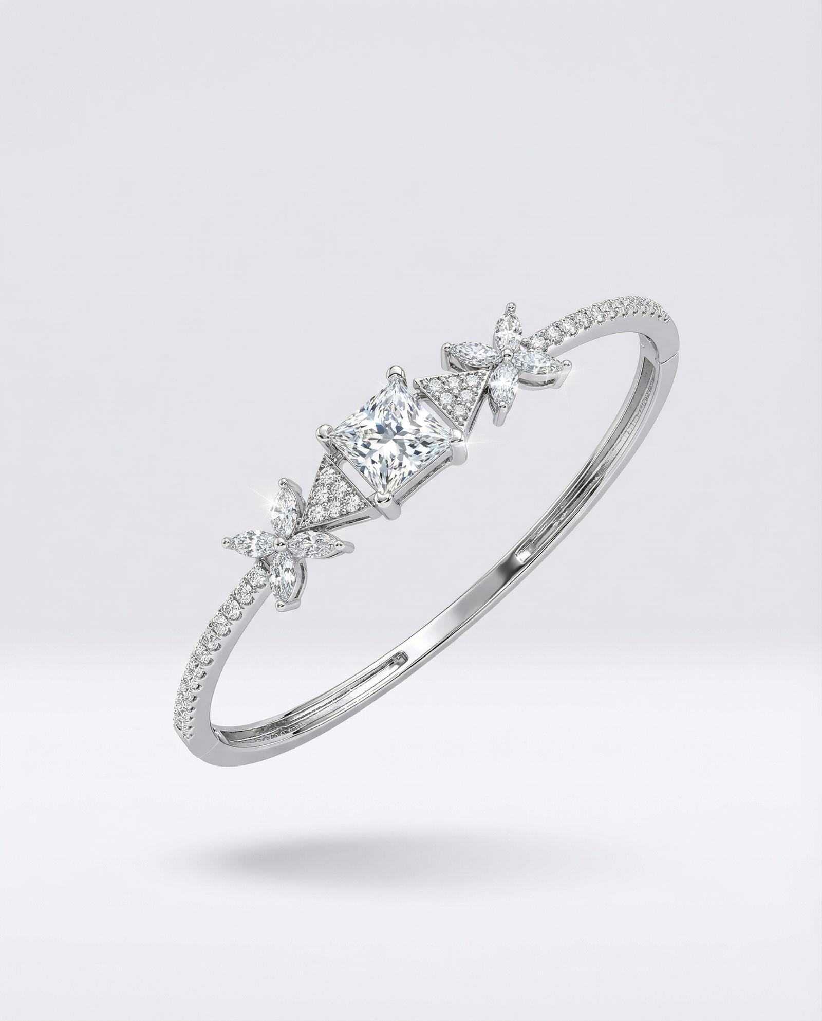 Elegant bracelet featuring a princess-cut center diamond with floral diamond accents.