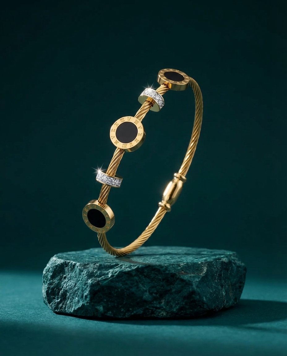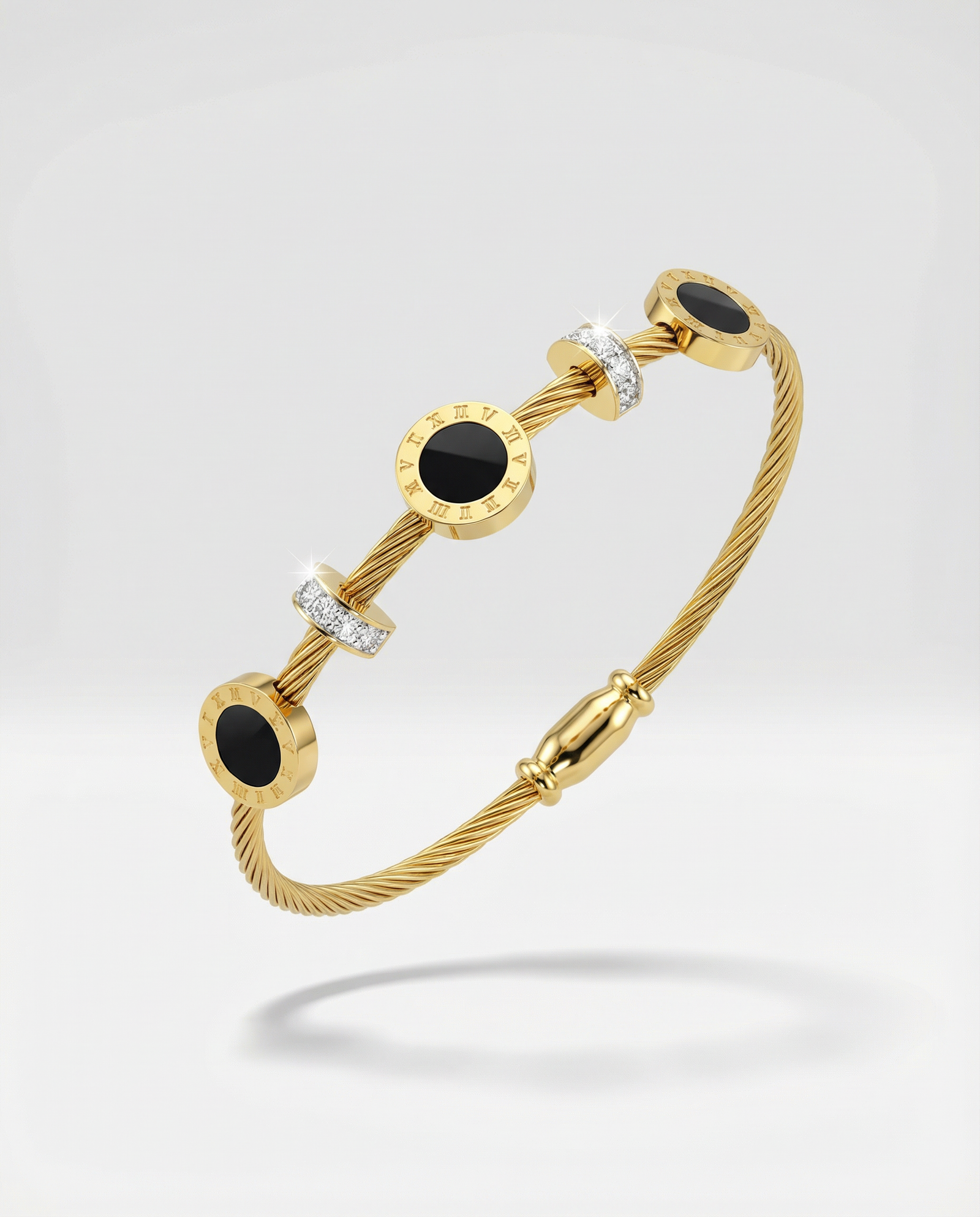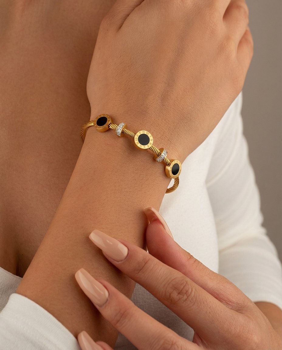 This elegant cable-style gold bracelet blends contemporary luxury with timeless design elements. Crafted with a sleek twisted gold cable band, the bracelet is adorned with bold circular motifs featuring deep black onyx centers framed by refined Roman numeral detailing.