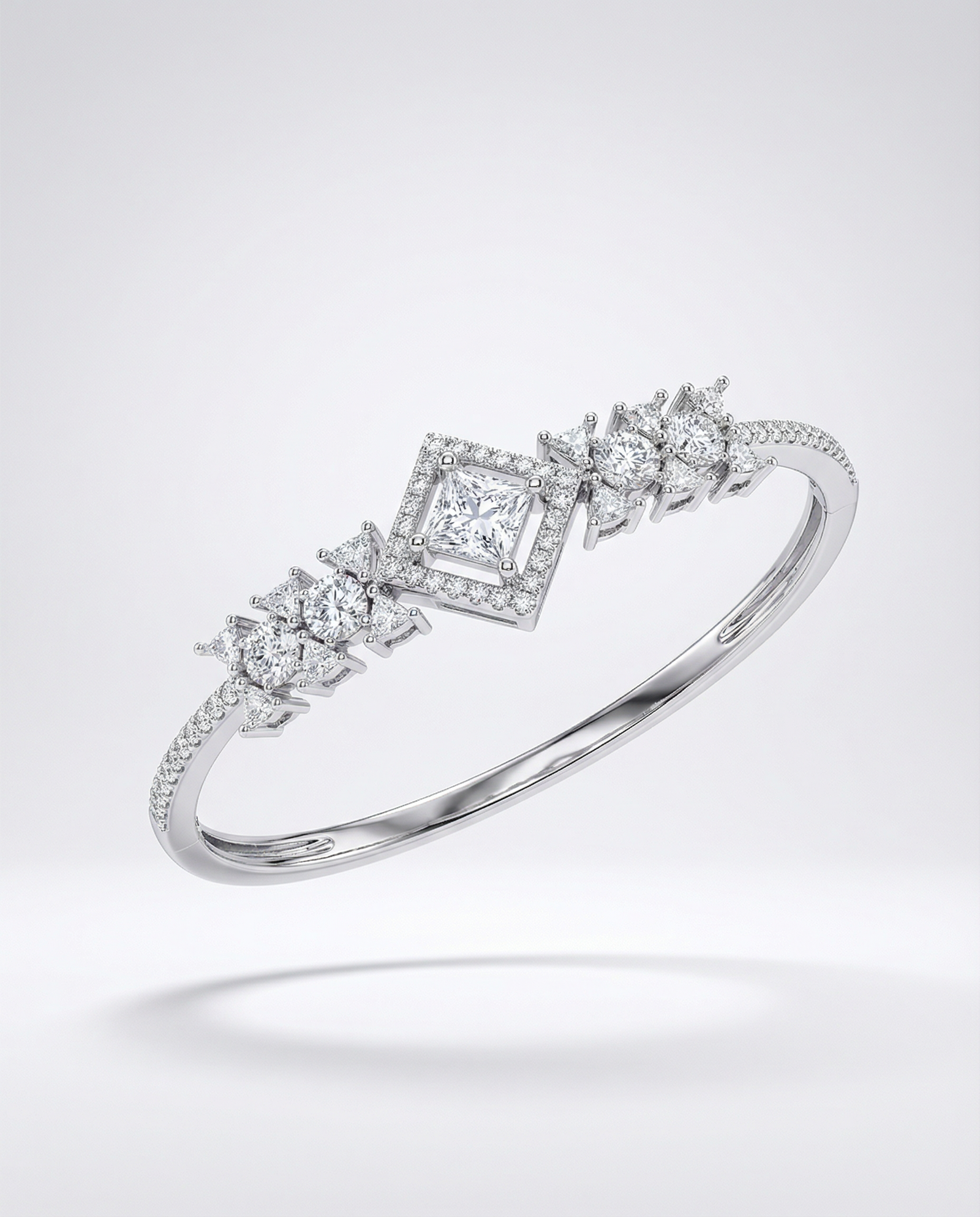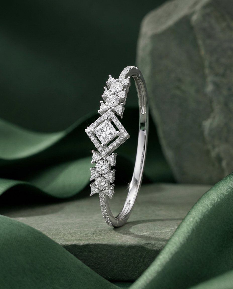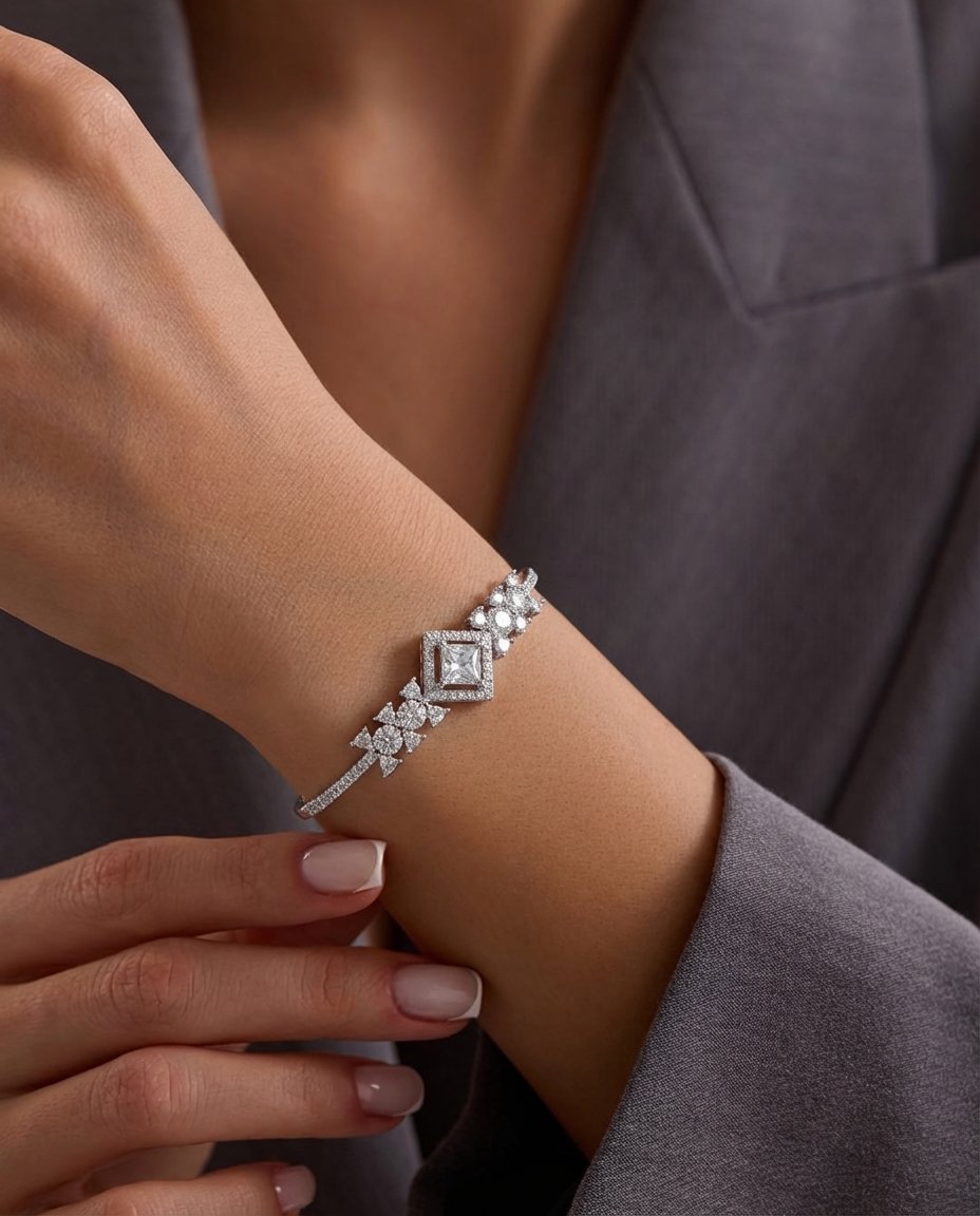 Perfect for special occasions, celebrations, and sophisticated evening wear, this bracelet blends contemporary geometry with soft floral artistry, making it a timeless addition to any fine jewellery collection.