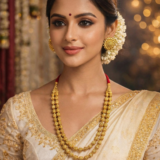 The necklace is designed with precise symmetry and fine craftsmanship, giving it a classic heritage appeal suitable for grand occasions. Its detailed beadwork adds depth and texture, making it visually striking yet refined.