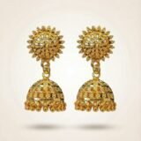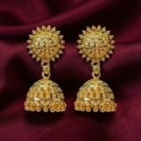 These beautifully designed gold jhumka earrings feature a striking sun-inspired motif at the top, symbolizing radiance and timeless beauty. The intricate circular detailing flows into a traditional dome-shaped jhumka adorned with delicate gold bead hangings that create graceful movement.